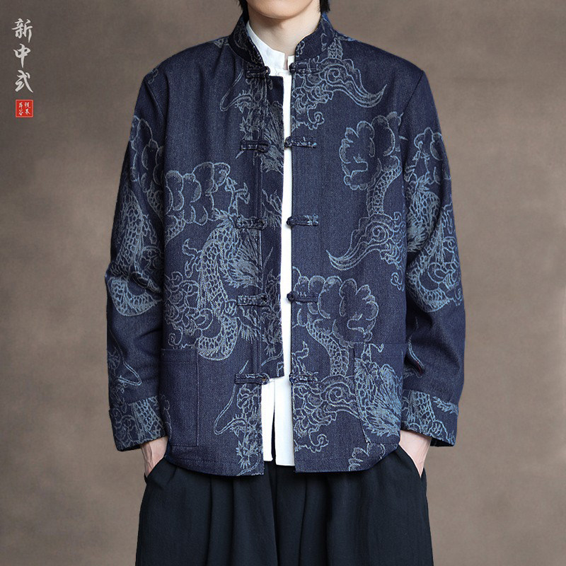 New Chinese loose plus size denim Tang jacket, Chinese style dragon pattern buckle tunic top, national style layman's suit