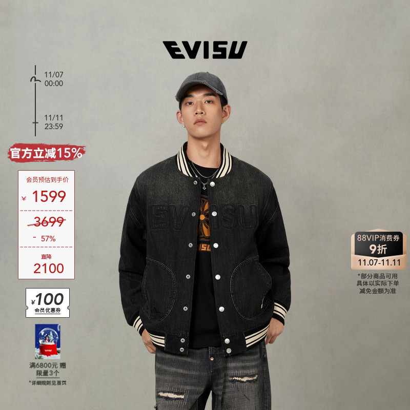 EVISU Fall 2025 New Men's Logo Embroidered Baseball Jersey Collarless Casual Commuter Denim Jacket
