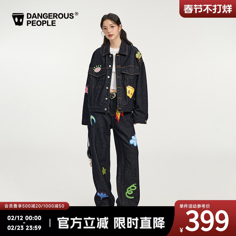 Dangerouspeople Xue Zhiqian dsp Childlike Denim Print Trendy High Street Loose Jacket Pants Suit