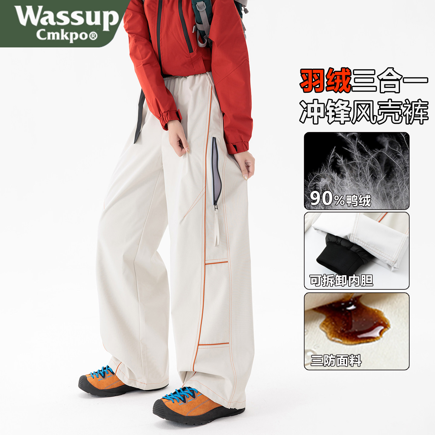 WASSUP CMKPO 3-in-1 Down Charger Pants Women's Winter Fleece Thickened Cargo Pants Detachable Ski Pants