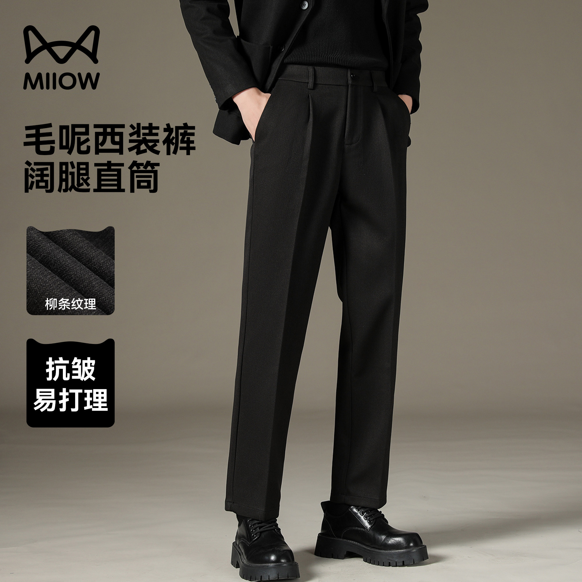 Cat man woolen casual trousers, men's spring drape, high-end black business fleece suit pants, straight-leg pants