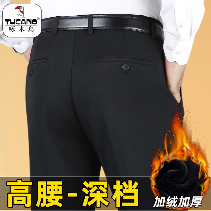 Woodpecker men's trousers dad pants autumn and winter thick middle-aged and elderly men's pants with fleece thickened slacks suit pants