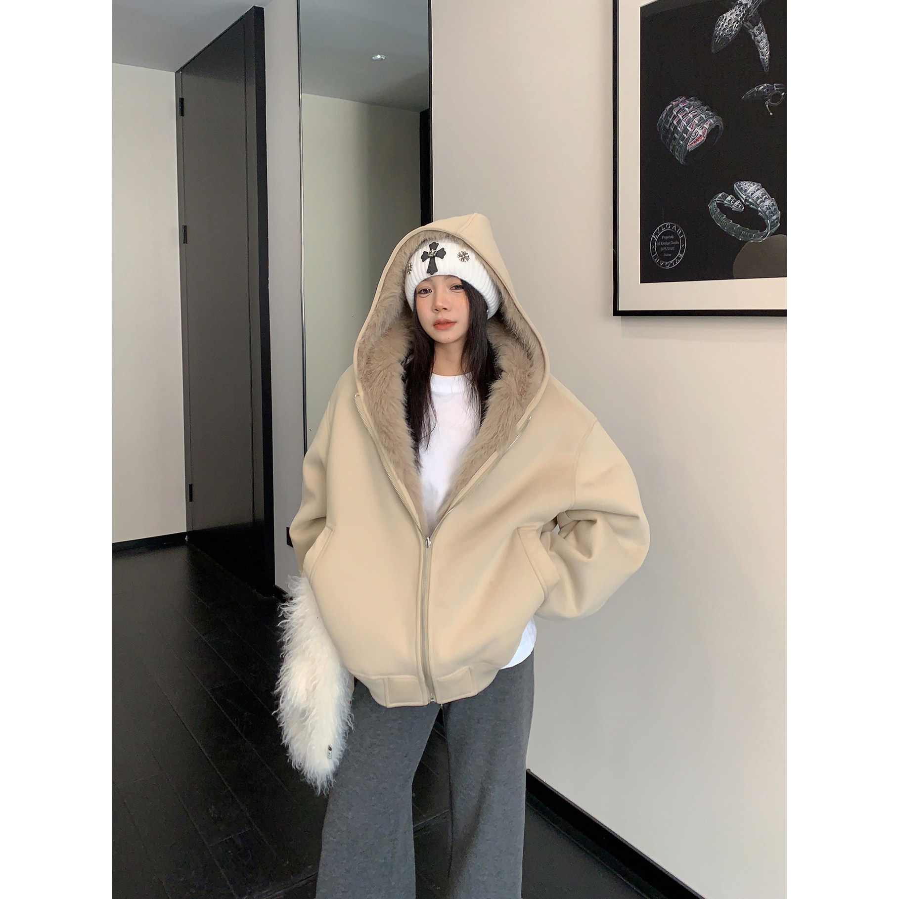 Waste wood winter relaxation heavy double-sided thickened hooded jacket women's short foreign style warm fur jacket trend