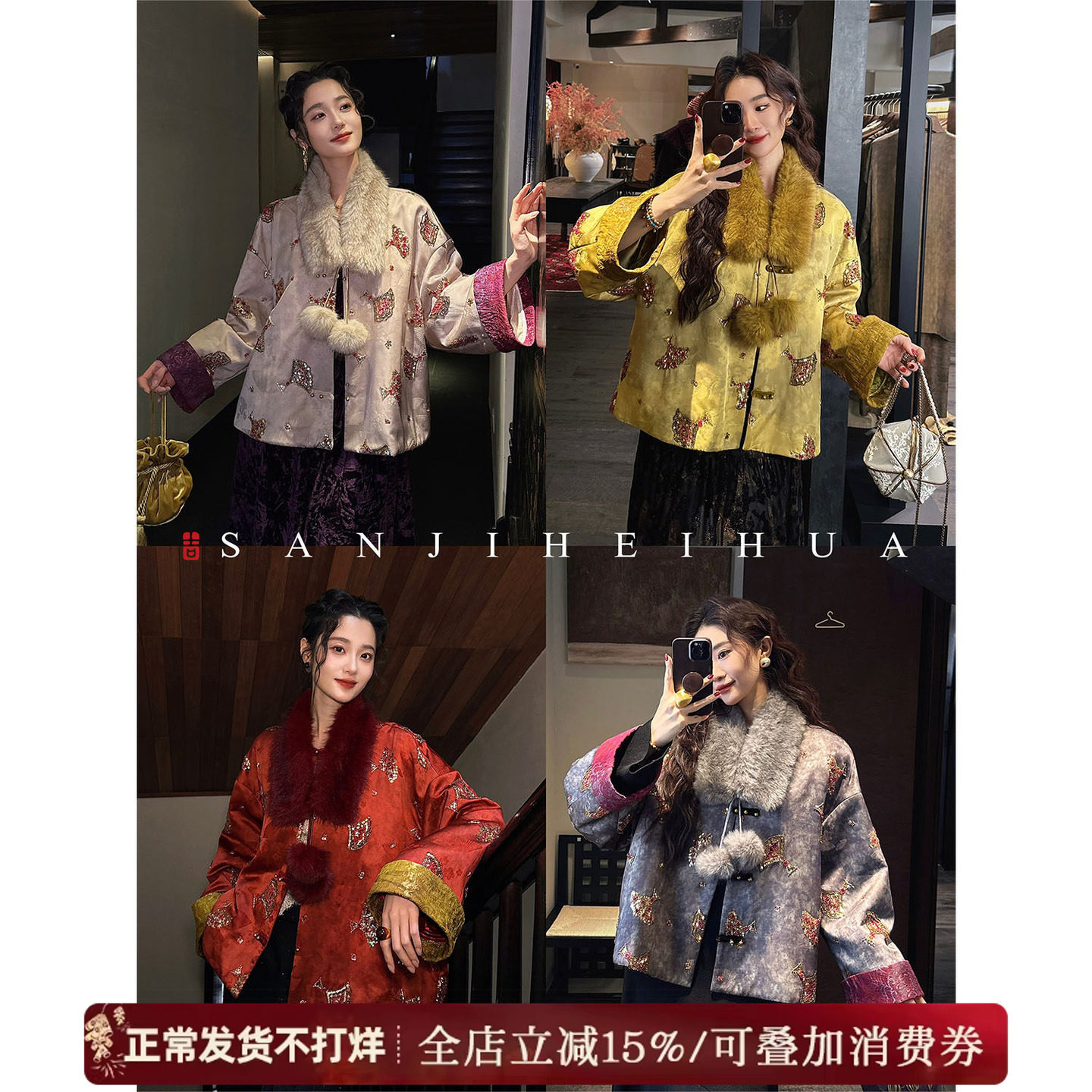 Sanji Black Flower [Ji Fan] New Chinese beaded embroidered jacquard silk cotton jacket women's clothing winter fashion this year