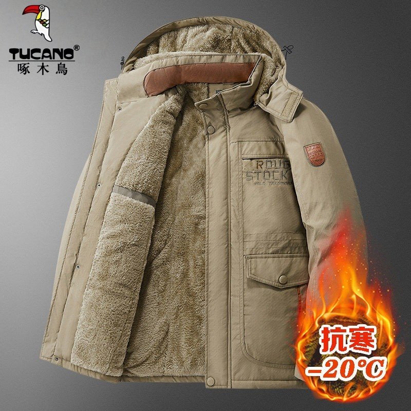 Woodpecker fleece thickened cotton jacket men's winter business casual cold and warm removable hat cotton jacket
