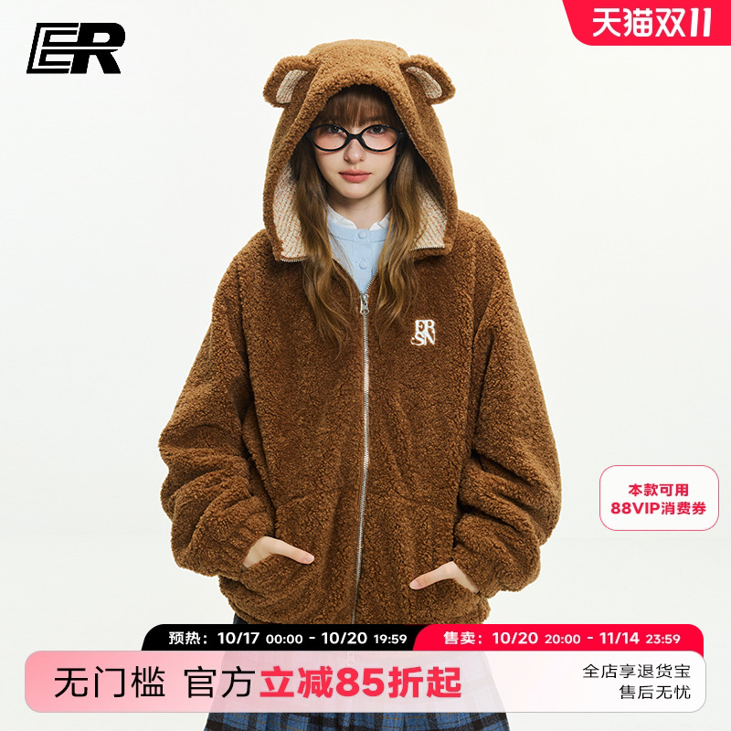 ER small fragrance cute bear ears, lazy wind, imitation lambswool jacket, autumn and winter warm hooded cotton clothes cardigan