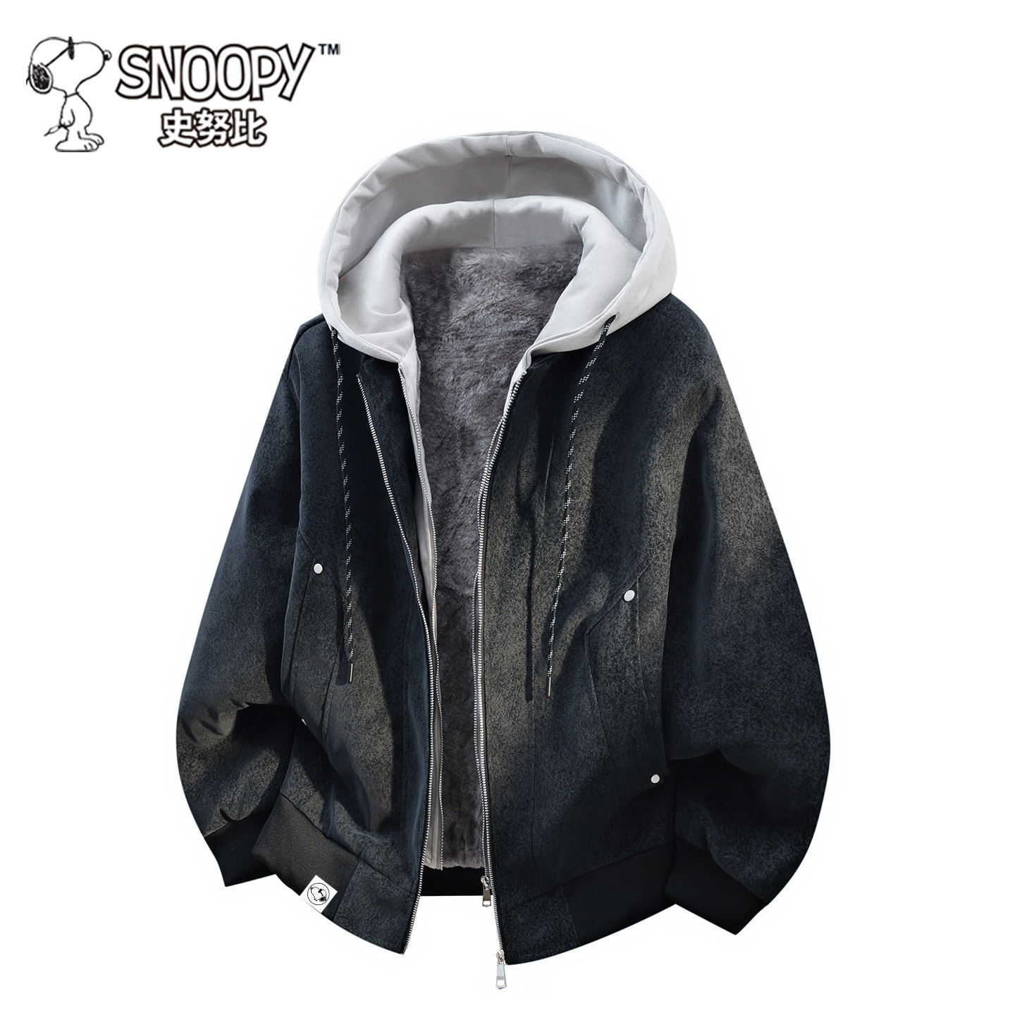Snoopy/Snoopy PU leather hooded fake two-piece cotton jacket men's 2025 fall/winter fleece thickened padded jacket