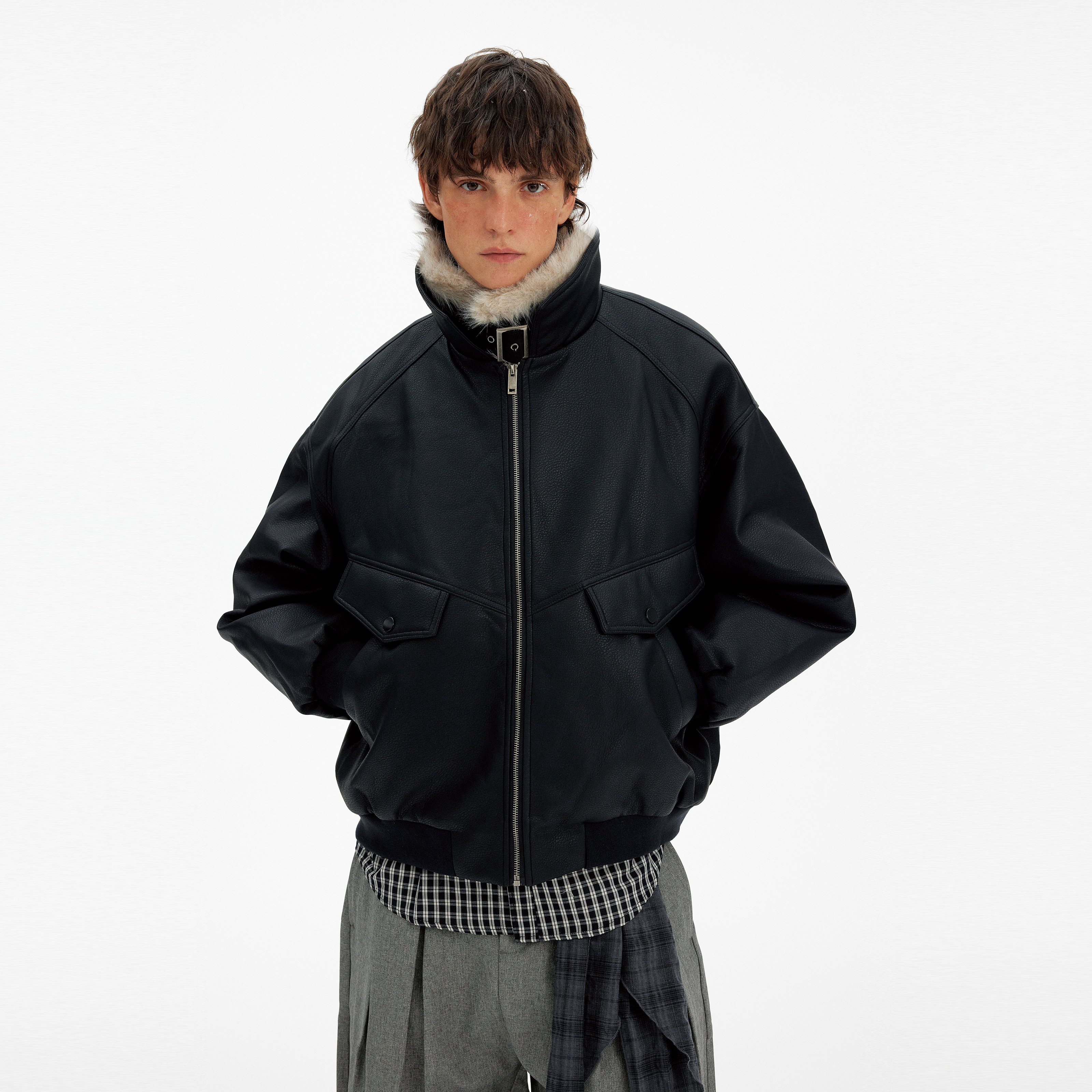 MADWITCH American vintage fur collar patchwork PU leather jacket cotton jacket for men and women winter warm thickened mountain carving jacket
