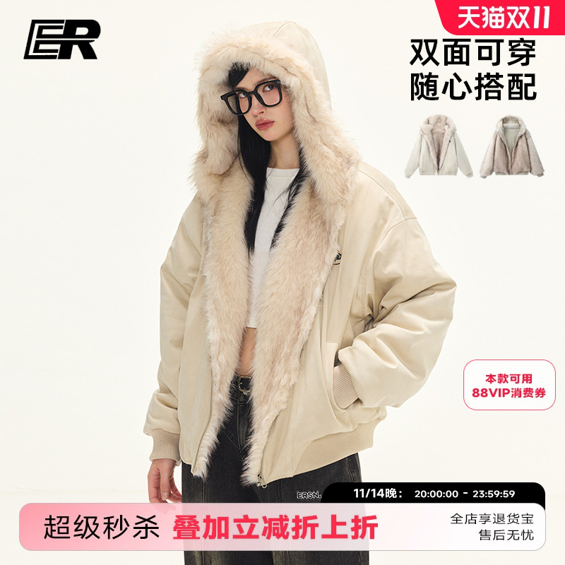 [Star Same Style] ER two-sided wearing mountain carved suede fur collar hooded jacket cleanfit American couple outfit
