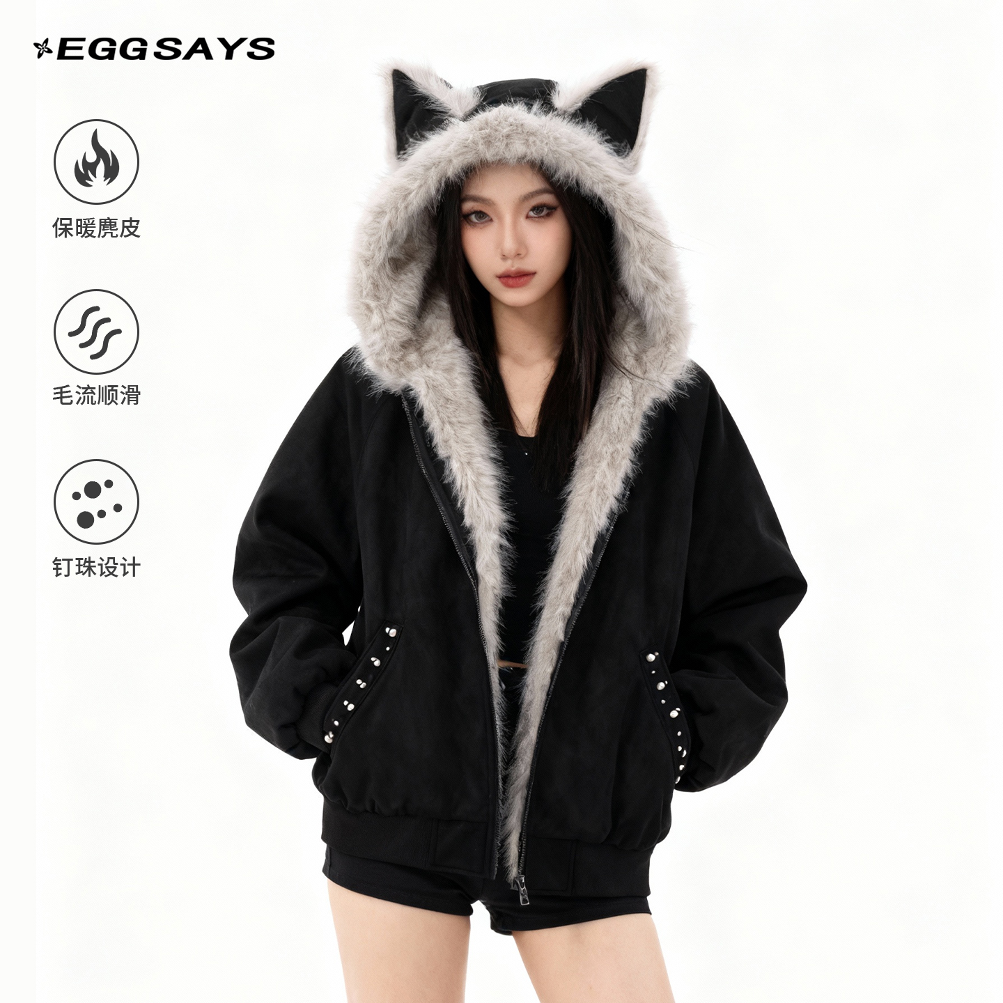 EGGSAYS American mountain carving winter thickened cotton clothes cotton clothes women's nail bead cardigans fur collar suede jacket men