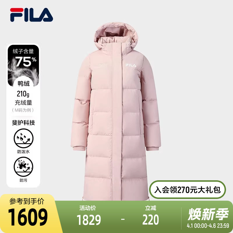 FILA Official Women's Long Down Jacket 2025 Winter New Stylish Casual Warm Hooded Jacket
