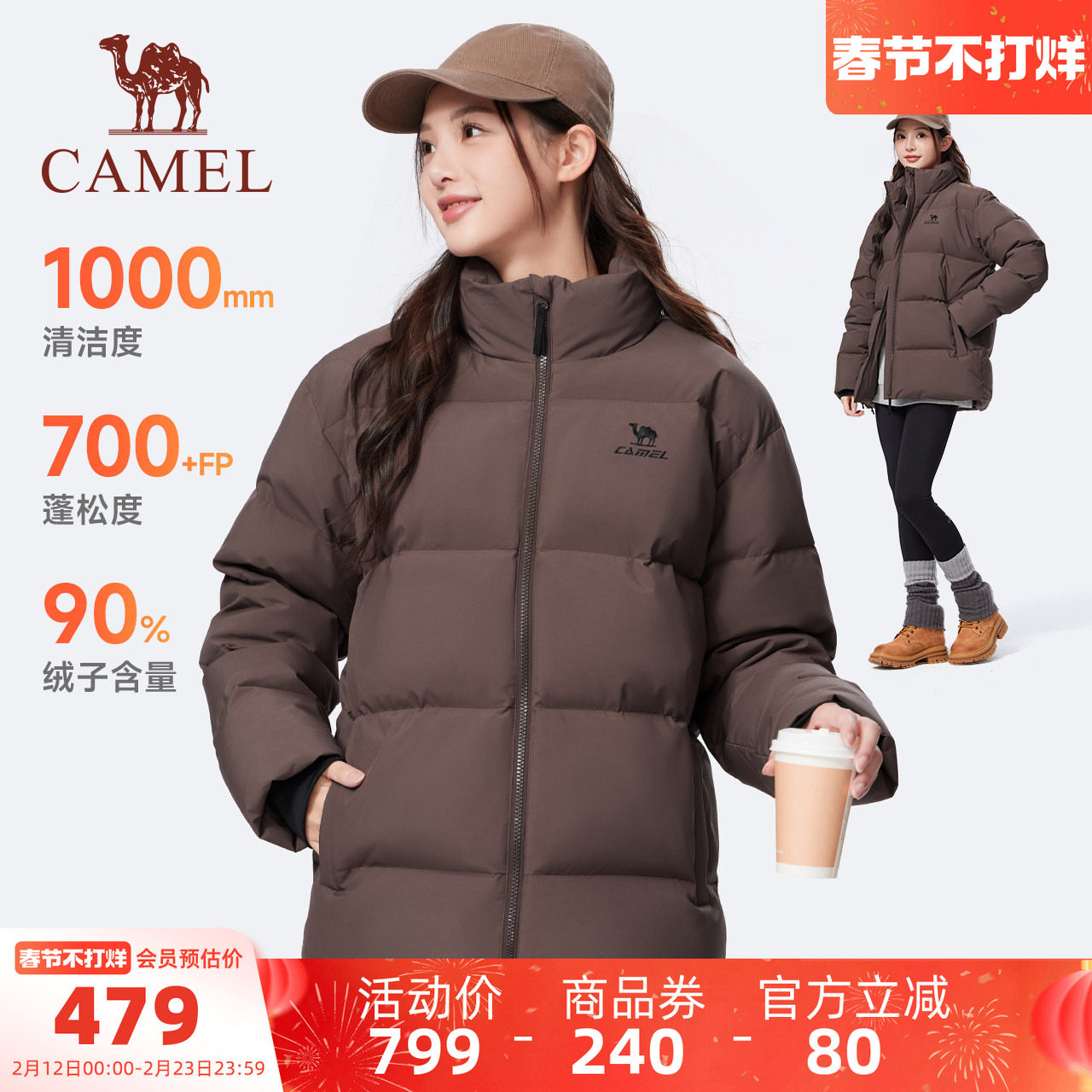 [Camel Vulcan] sports three-proof stand-up collar down jacket women's winter new outdoor thickened bread jacket men
