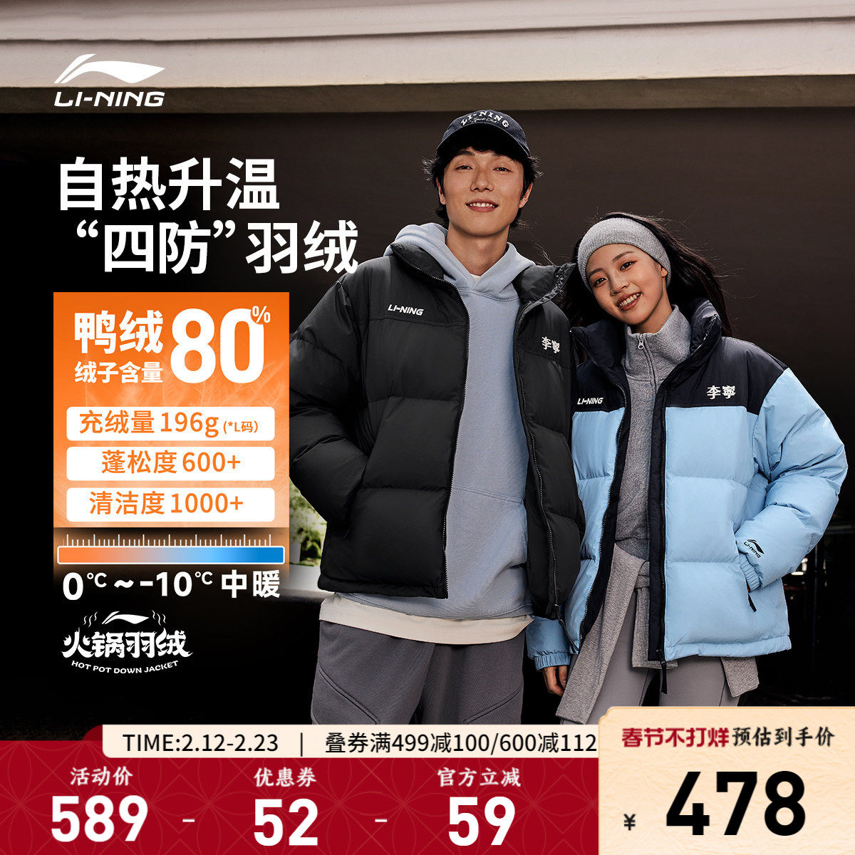 Li Ning hot pot down jacket丨Men's winter duck down short clothes for couples warm red stand-up collar sports jacket women