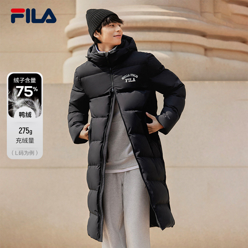 FILA Couple Long Down Jacket Women's 2025 Winter New Warm and Coldproof Hooded Double Ended Zipper Jacket Men
