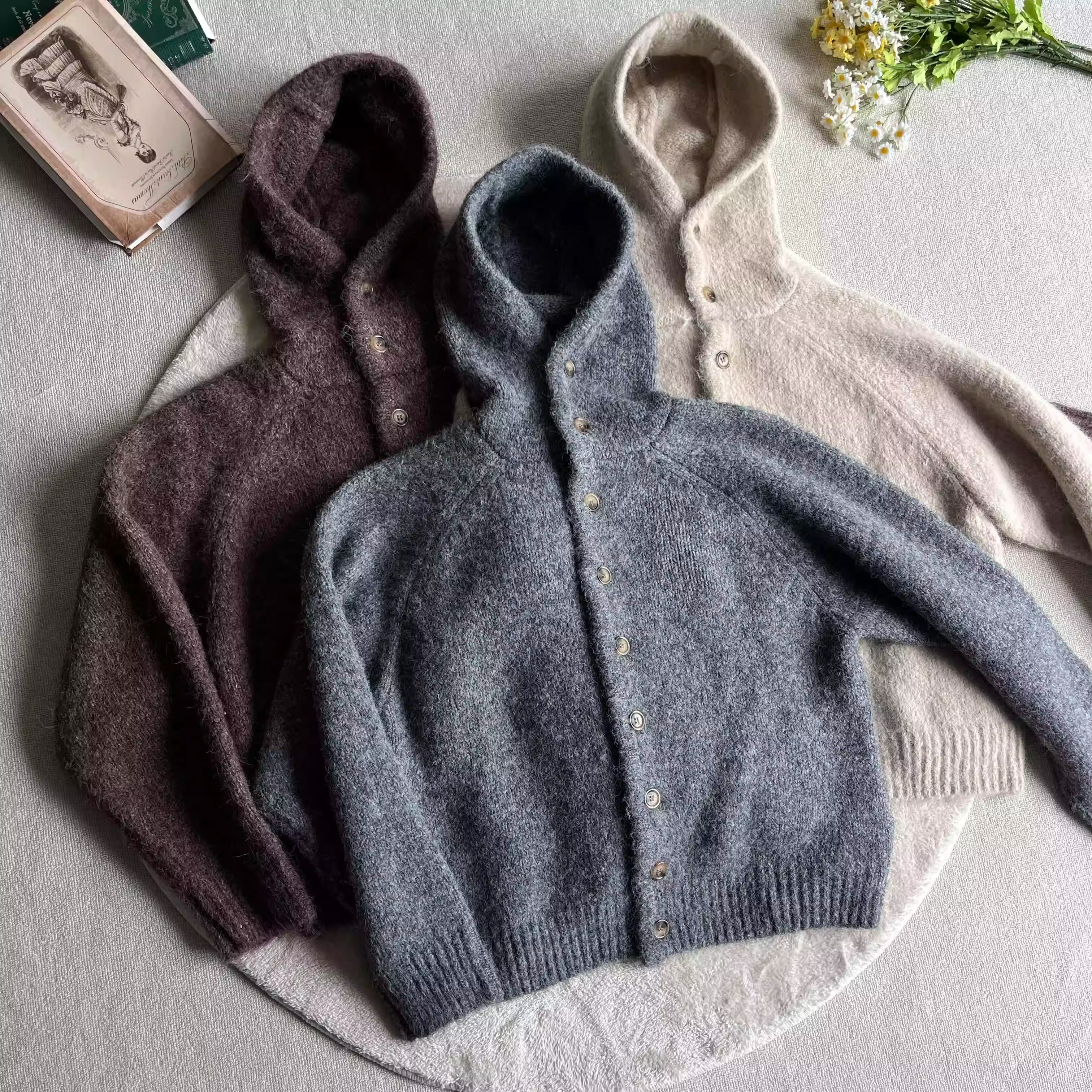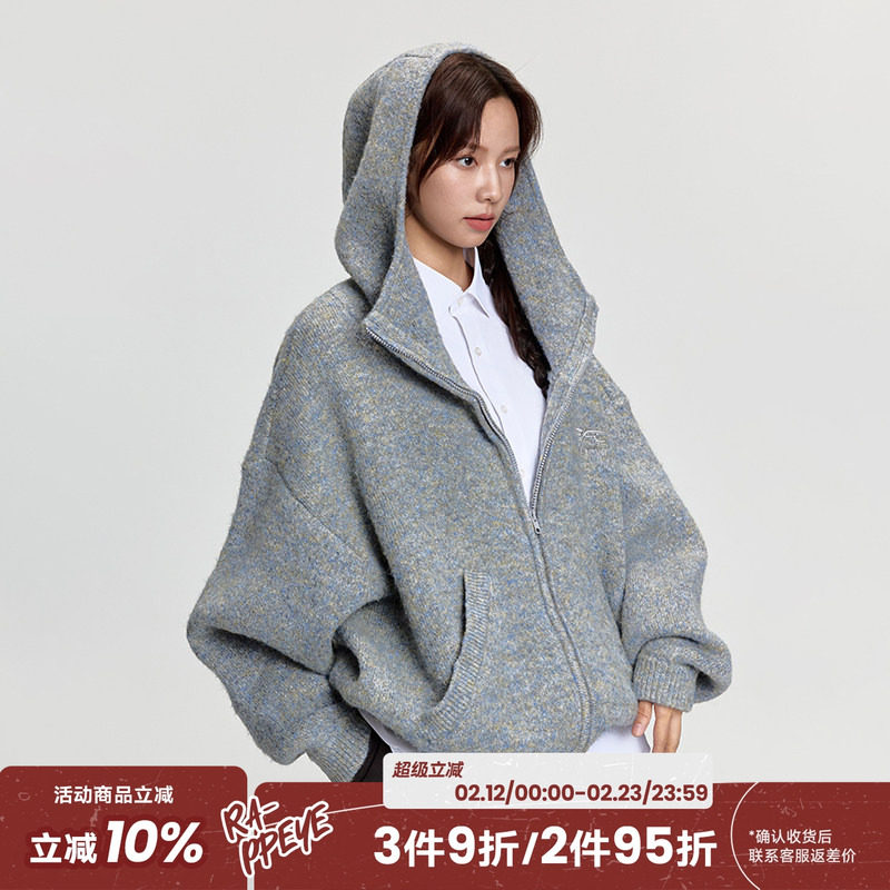 RAPPEYE Versatile Preppy Loose Knit Hooded Cardigan Top Faux Mohair Sweater Jacket Women