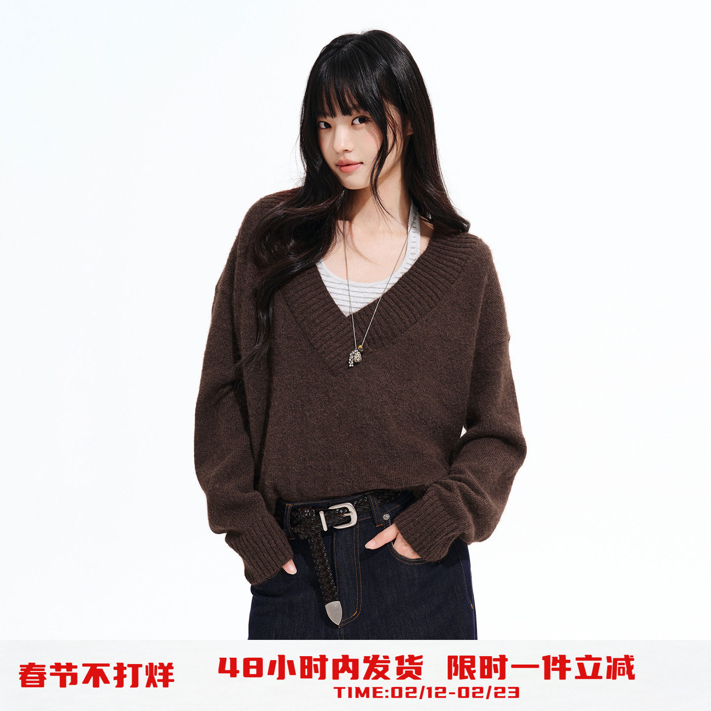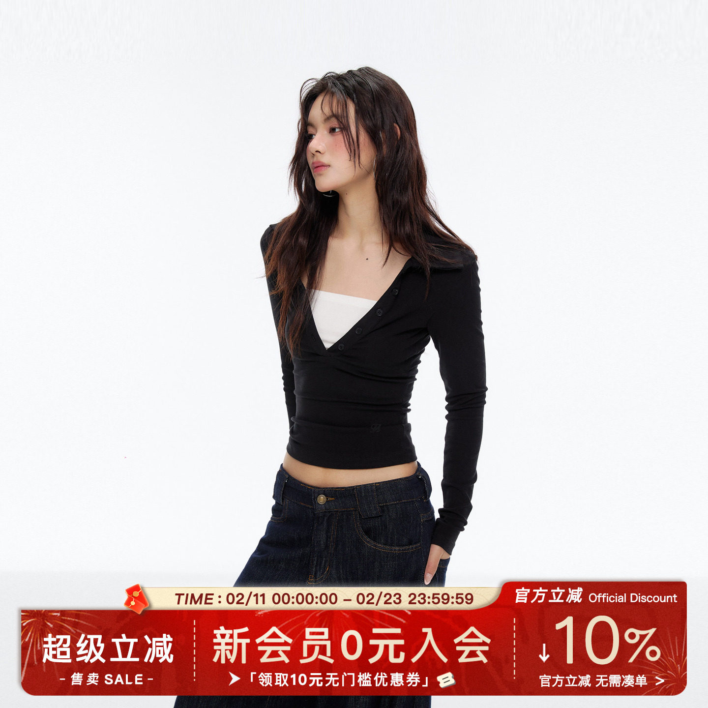 Archivum Fake Two Contrasting Polo Deep V-Neck Knit Long Sleeve Versatile Commuter Slimming Spice Top