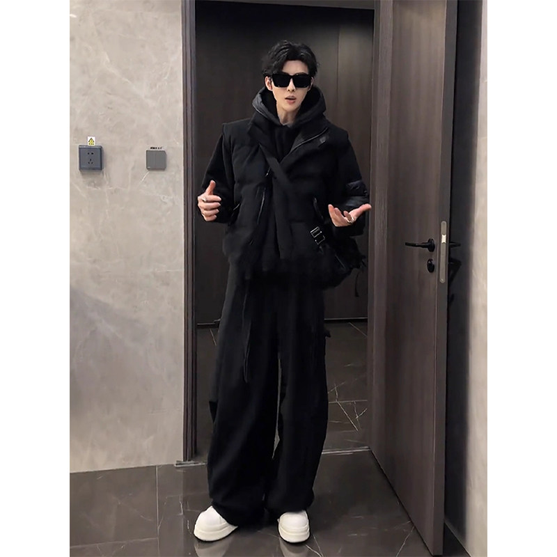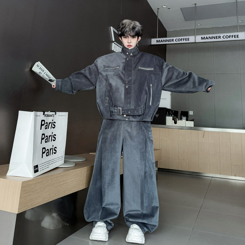 Winter American retro deconstructed stand-up collar zipper jacket set men's design sense wide-leg trousers thickened two-piece set trend