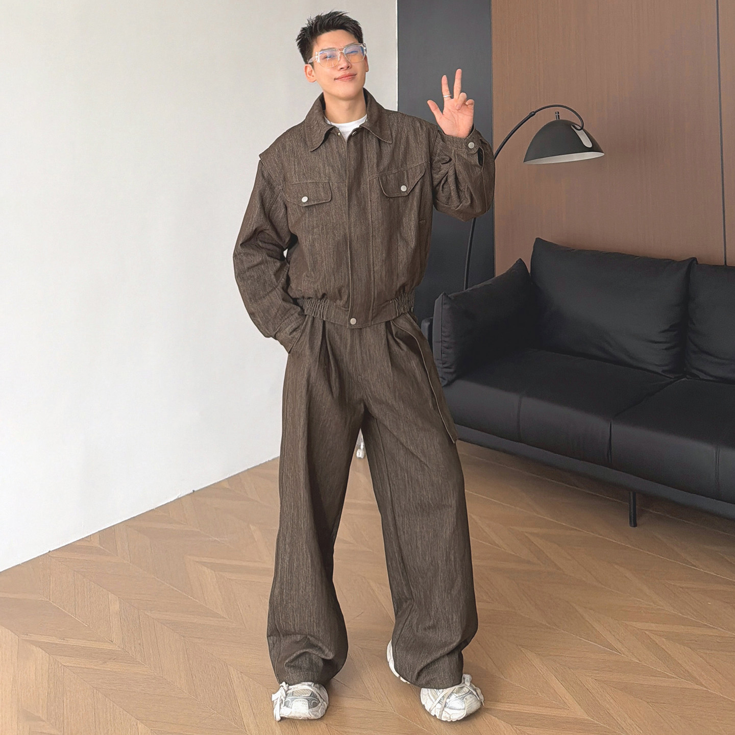 Zhu Zhazha high-end retro denim jacket men's jacket autumn and winter loose casual wide-leg pants thick 2-piece set