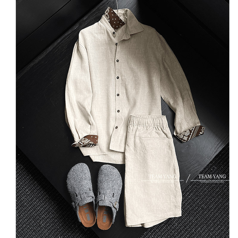 Old money style retro linen suit, men's summer high intelligence temperament wear, design shirt shorts, a complete set