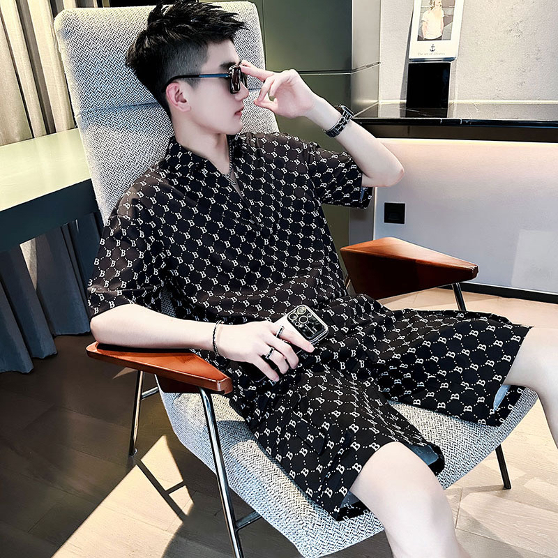 European Station New Mesh Suit Men's Casual Summer Thin Fashion Solid Color Embroidered Shorts Shorts Short Sleeve Shirt Men