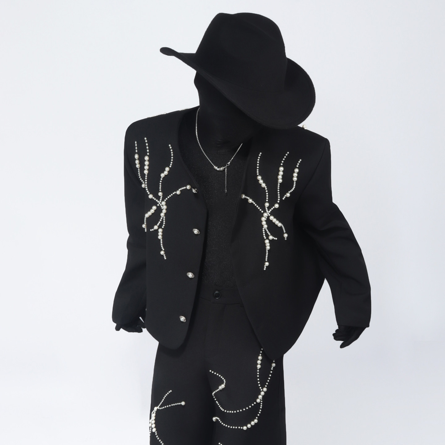 Black clothes high-end black beads versatile suit short shoulder pads fashionable temperament jacket pants