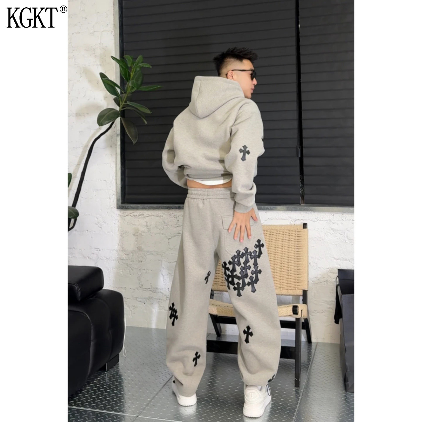 Hooded sweatshirt sweatshirt suit men's fall and winter fleece thickened high street cross flower design scimitar pants two-piece set