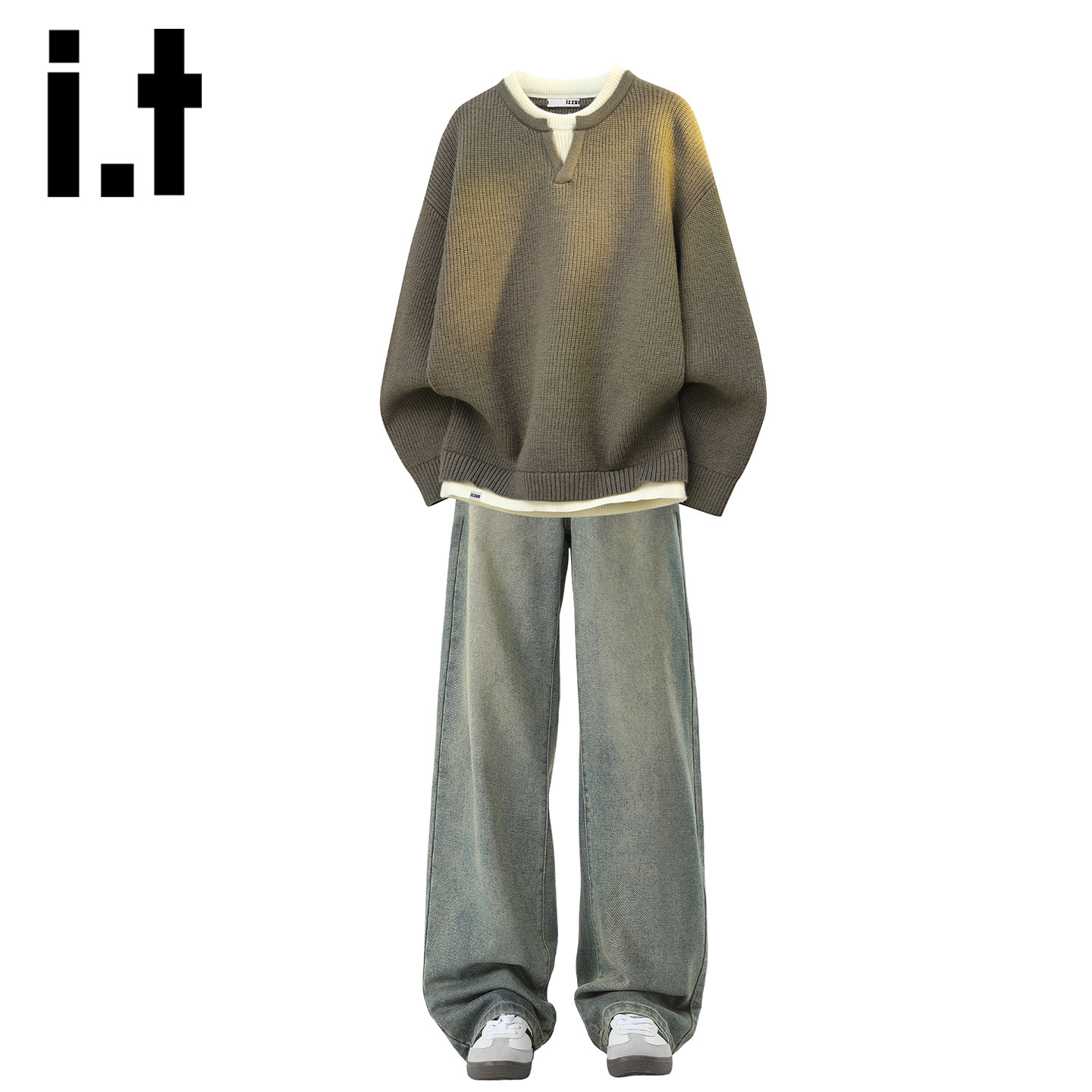 it izzue men's spring ruffian versatile two-piece suit loose V-neck sweatshirt with nostalgic jeans ootdY
