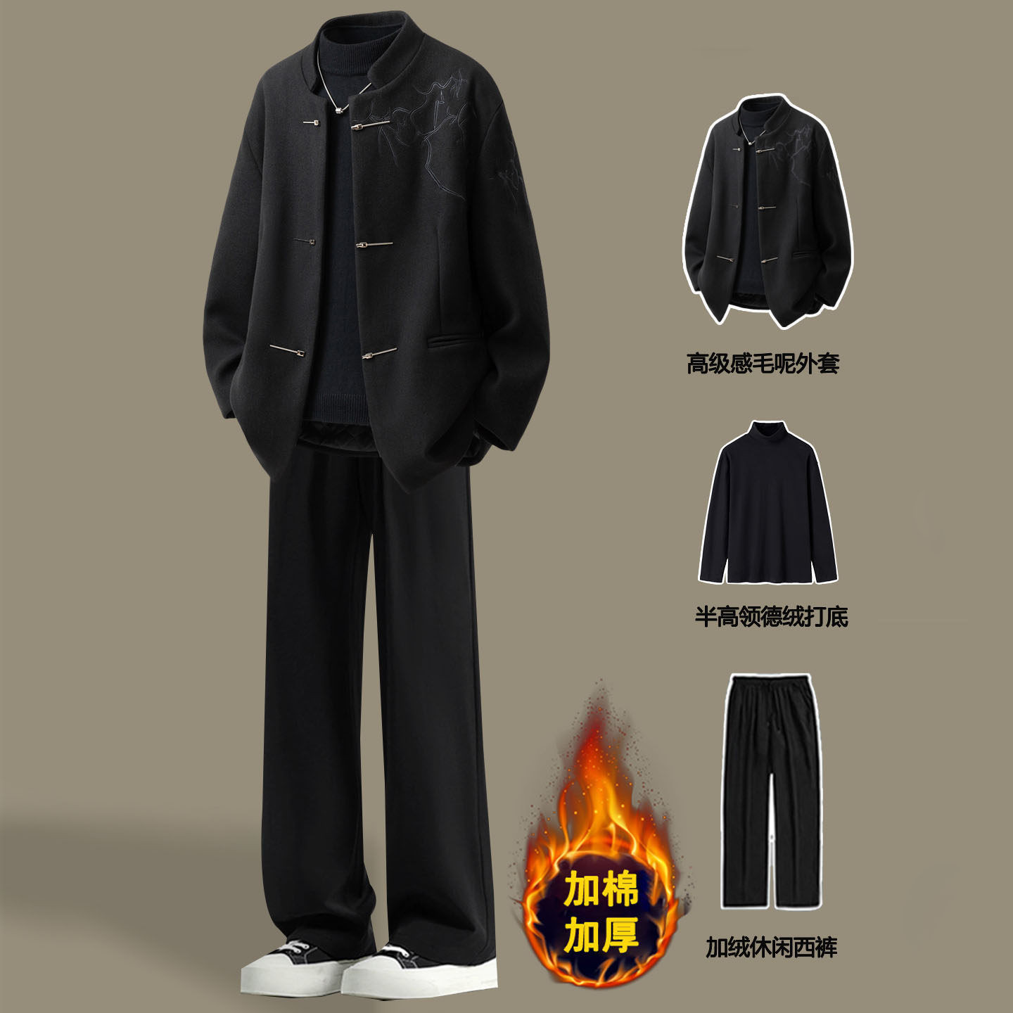 New Chinese suit suit men's winter thickened embroidered woolen jacket with suit pants A complete set of high-end feel