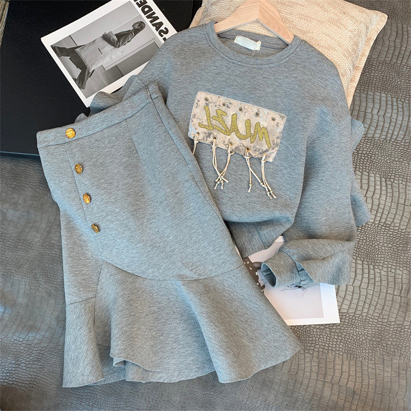 High-end niche loose casual sportswear set women's autumn crew neck sweatshirt hip skirt two-piece set