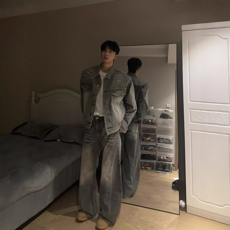 American vintage washed distressed smoky gray denim jacket for men and women loose versatile shoulder pad jacket men's set for men