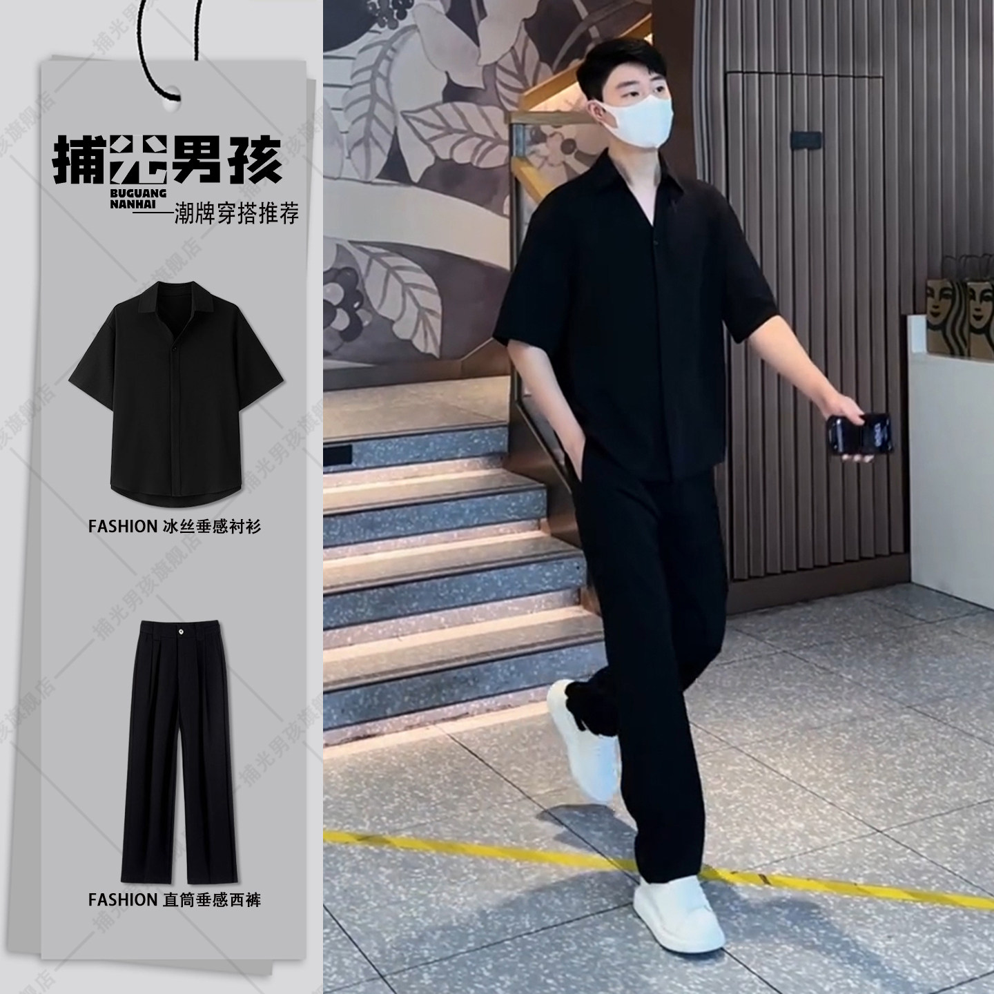 Korean version of ruffian V-neck short-sleeved shirt draped suit pants acetate ice silk suit men's summer old money high-end sense