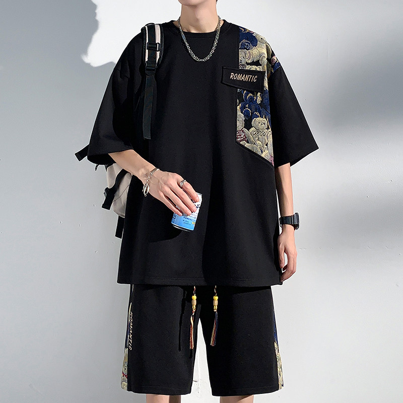 National tide suit men's summer trendy brand splicing Chinese style two-piece set of loose casual large size short-sleeved bear shorts
