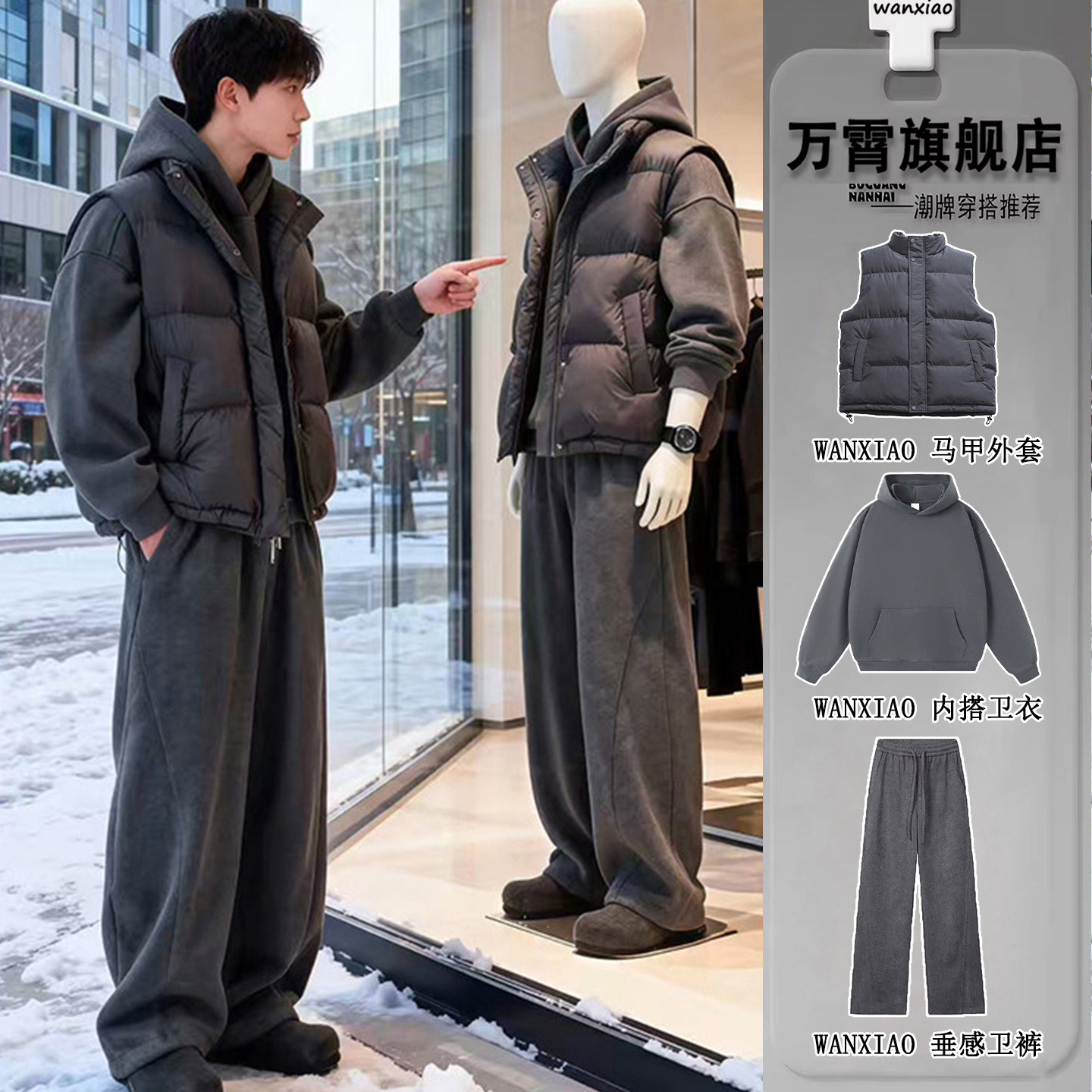 Gray sleeveless shoulder layered vest cotton suit autumn and winter ootd outfit set men's sweatshirt with sweatpants three-piece set