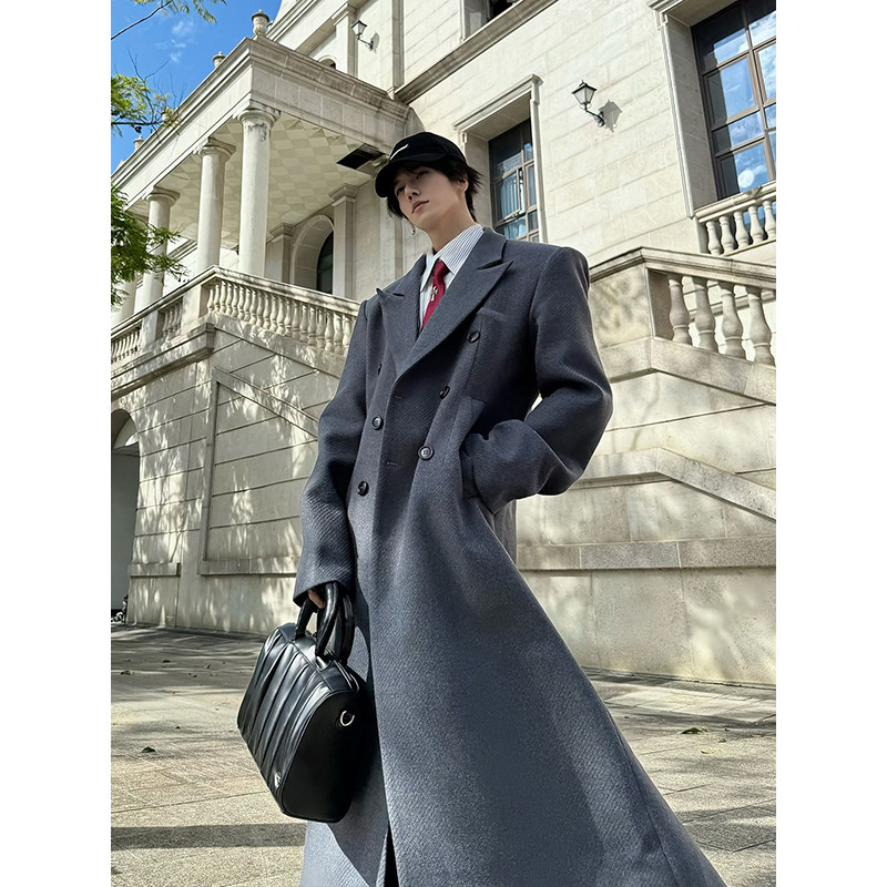 British style mid-length godfather woolen shoulder pad coat men's winter high-end gray cleanfit trench coat