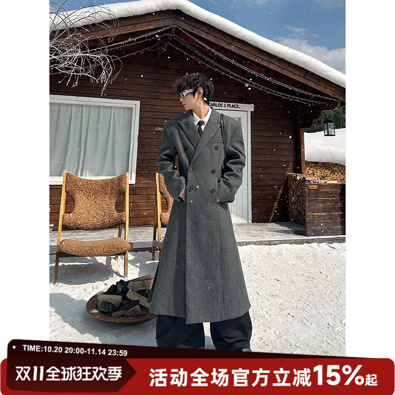 Autumn mountain style/niche dark gray shoulder pad woolen coat men's high-end design winter mid-length trench coat