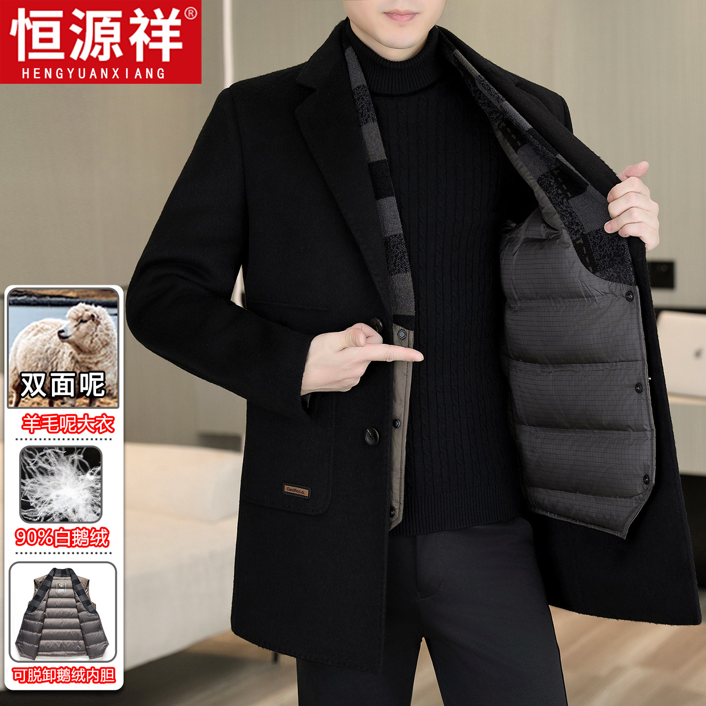 Hengyuanxiang high-end goose down liner cashmere reversible woolen coat men's mid-length wool coat thickened in autumn and winter