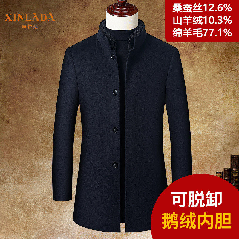 Cashmere men's coat mink stand-up collar thickened autumn and winter wool wool men's coat mid-length goose down liner can be removed