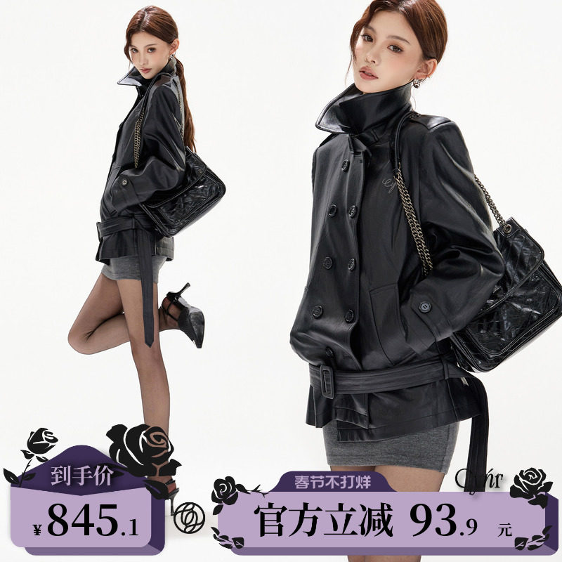 CYNR original design cool style stand-up collar double-breasted crisp leather jacket tie-up waist mid-length jacket jacket for women