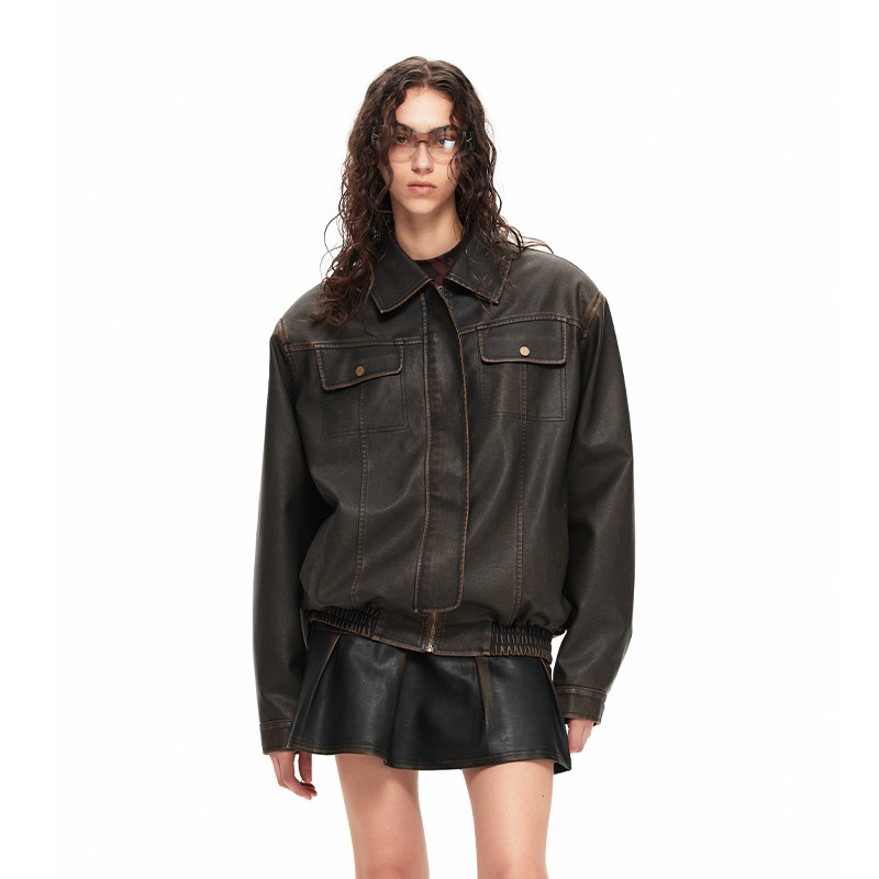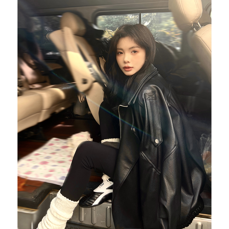 Kurosawa Genqi slightly chubby MM2025 autumn new leather jacket women's retro lapel cool sassy style loose jacket short style