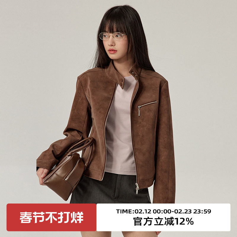 omont egg tart home vintage suede stand-up collar motorcycle jacket 2025 fall casual versatile zip jacket leather jacket
