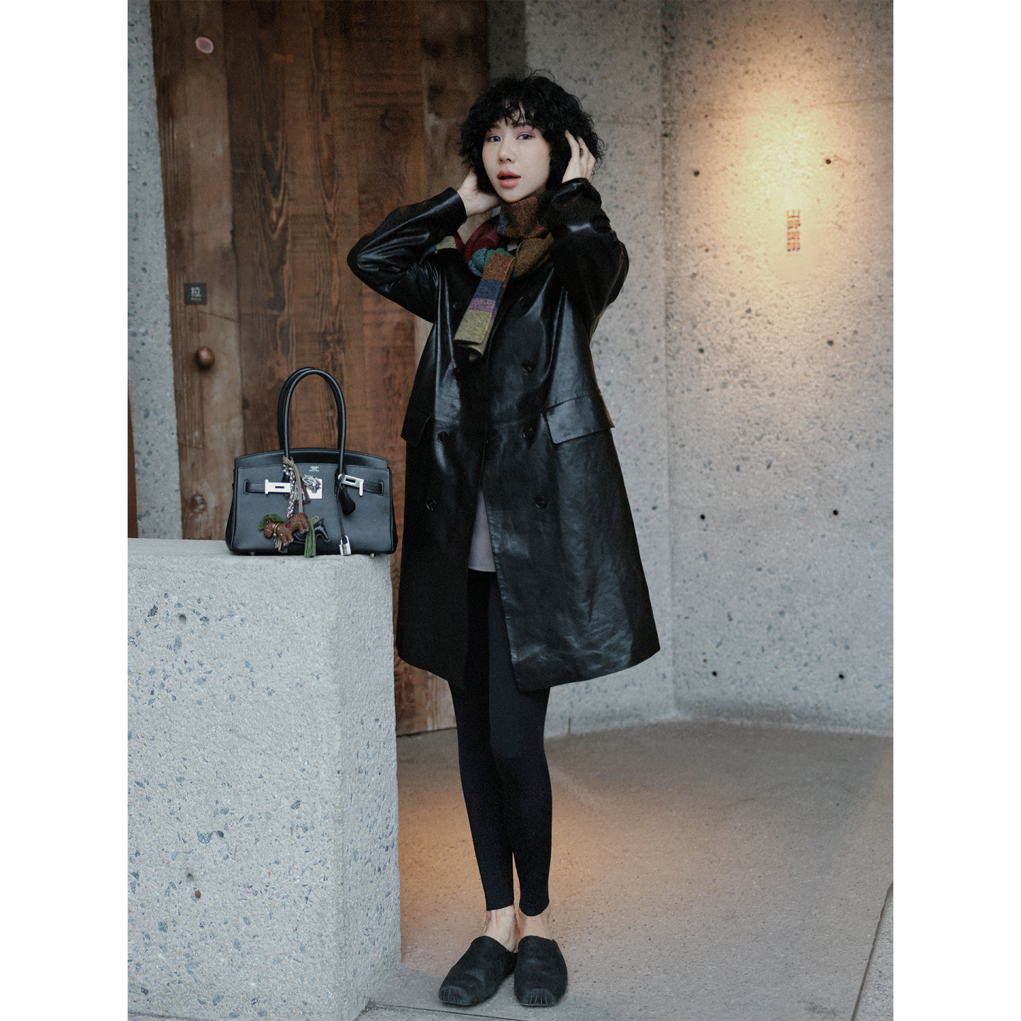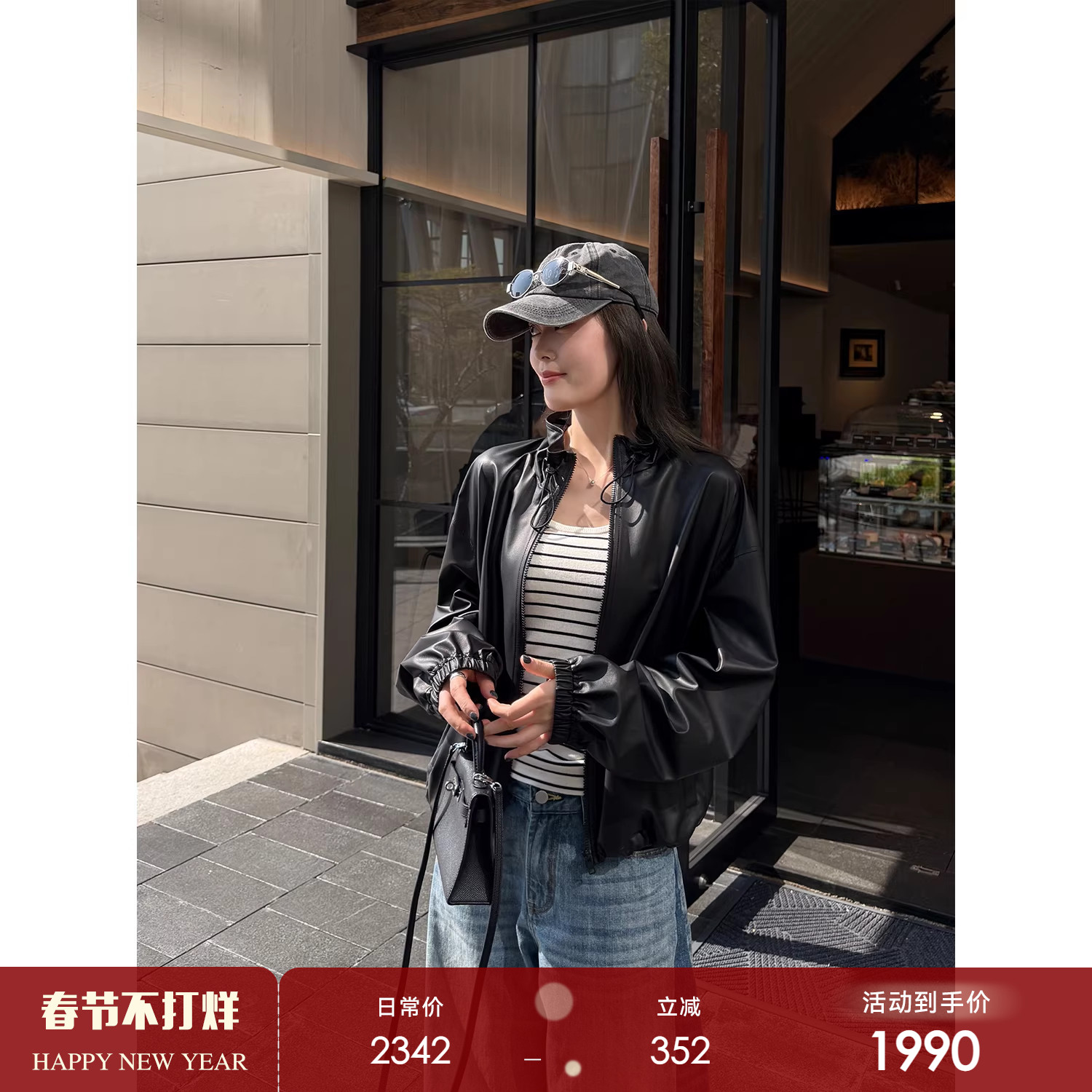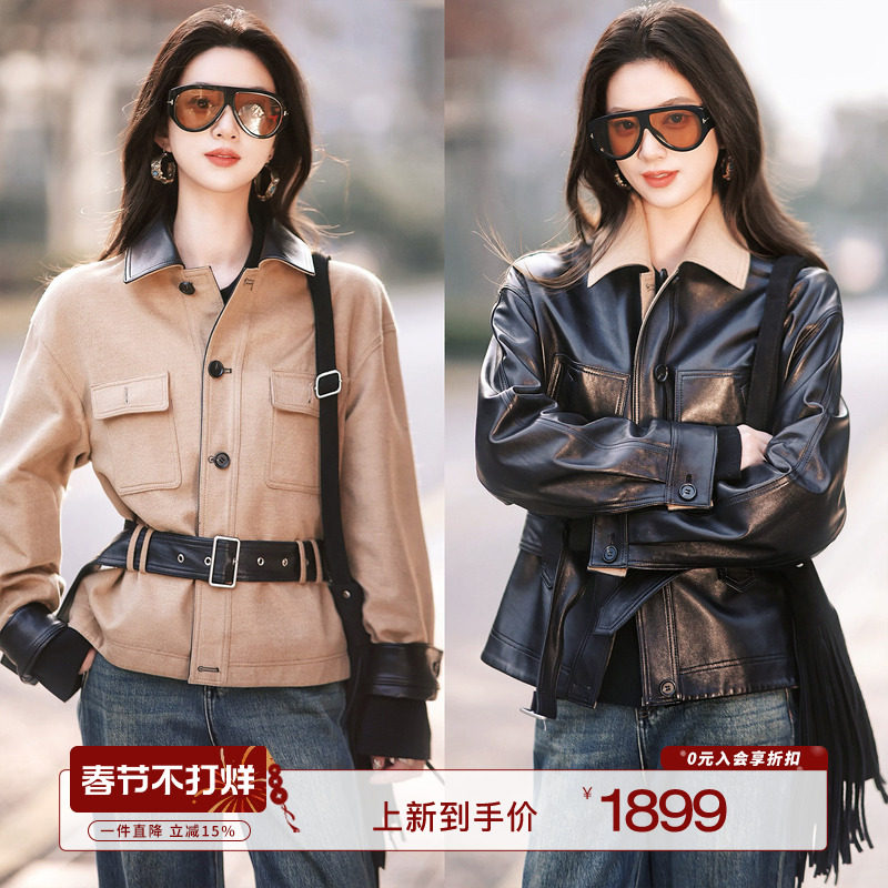 Fu Zhien weekend street shooting imported ACN* washed lapel sheepskin leather leather jacket short coat woman