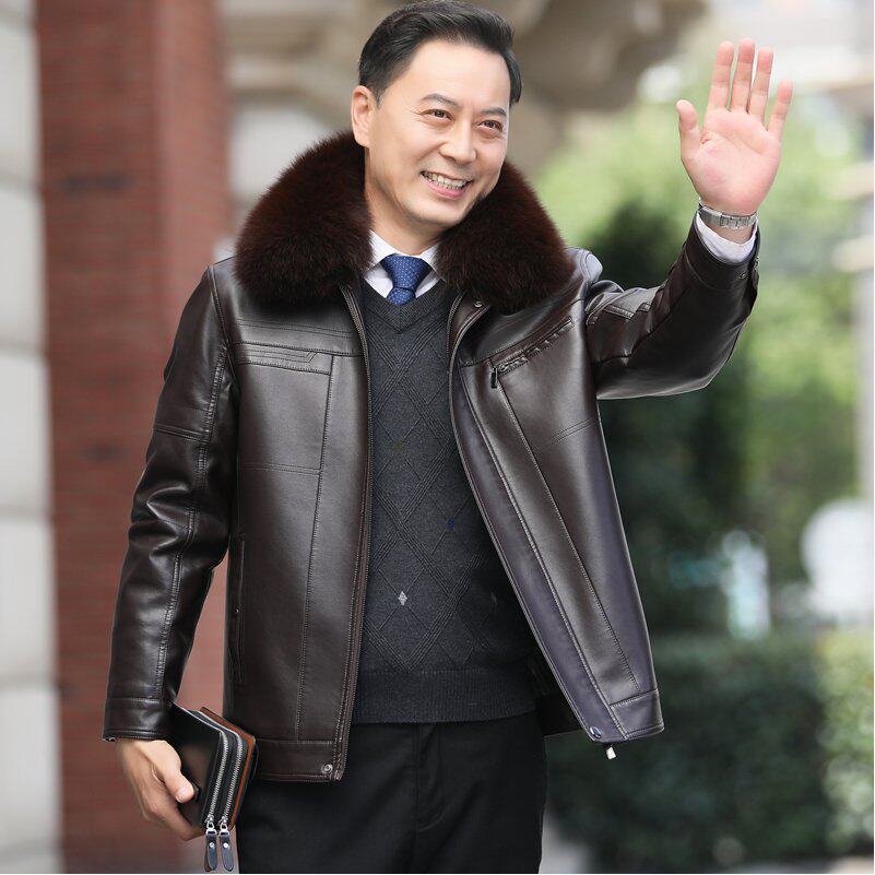 Middle-aged and elderly leather jacket male dad outfit fleece thickened fur collar jacket Haining fur winter middle-aged leather jacket