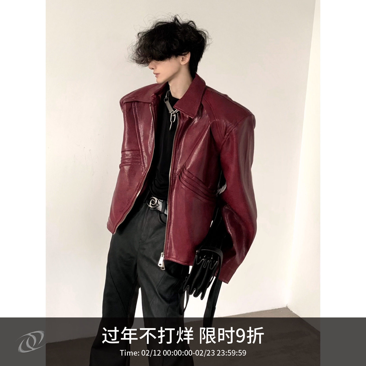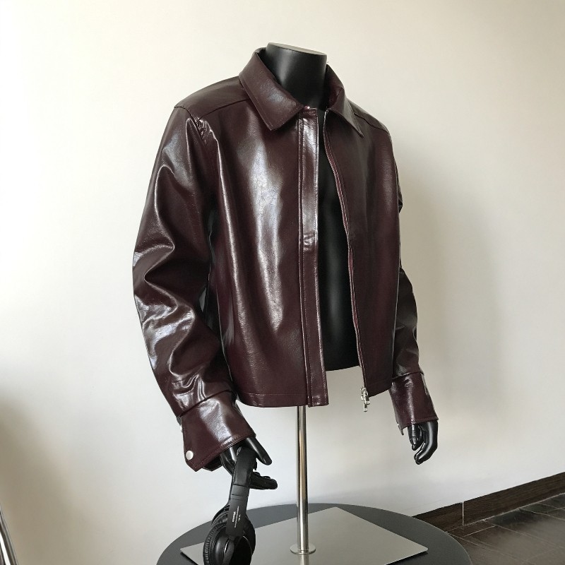 Autumn mountain style/niche American high street design, burgundy leather jacket, men's high-end sense of shoulder pads, jackets, ruffians