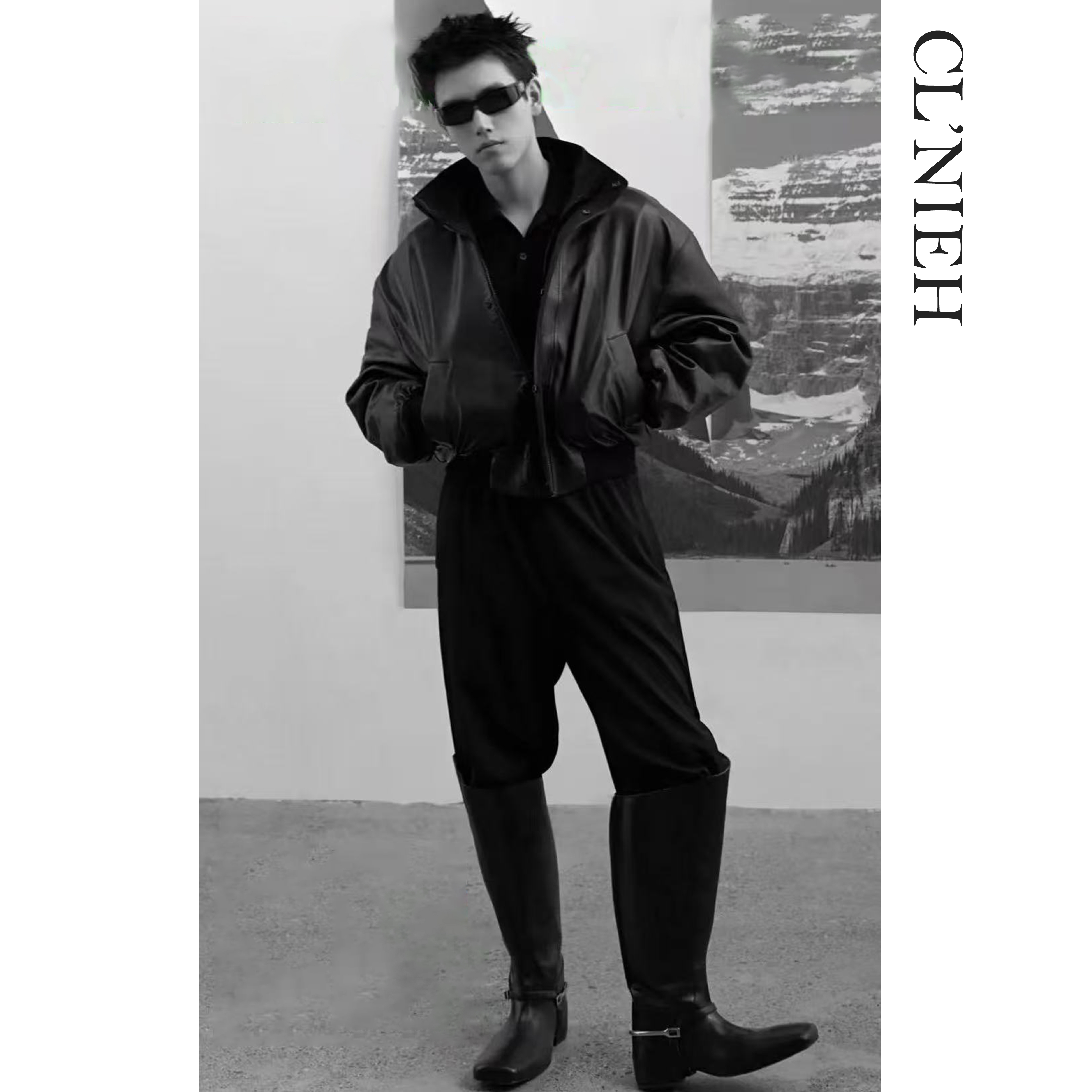CLNIEH | Imported semi-shiny grained sheepskin IDEAL zipper up-cut turtleneck leather jacket for men