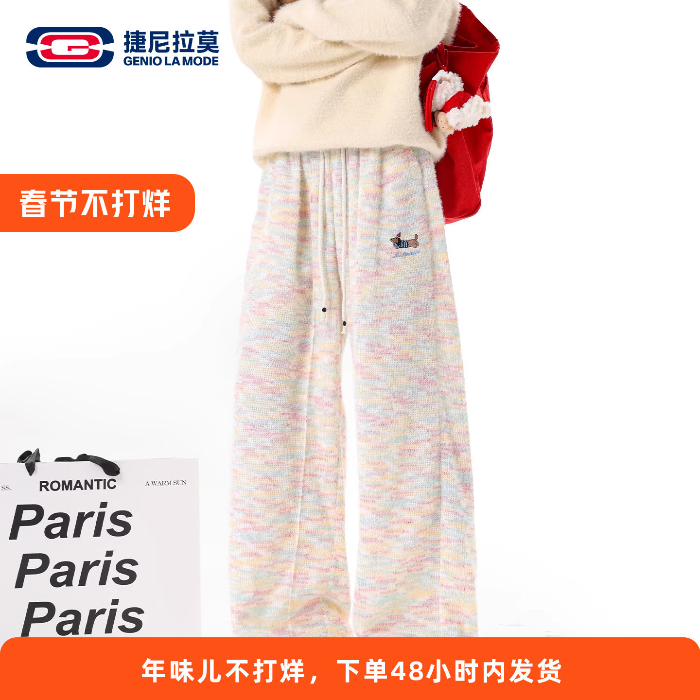 GENIOLAMODE embroidered rainbow dachshund casual pants for men and women with fleece in autumn and winter