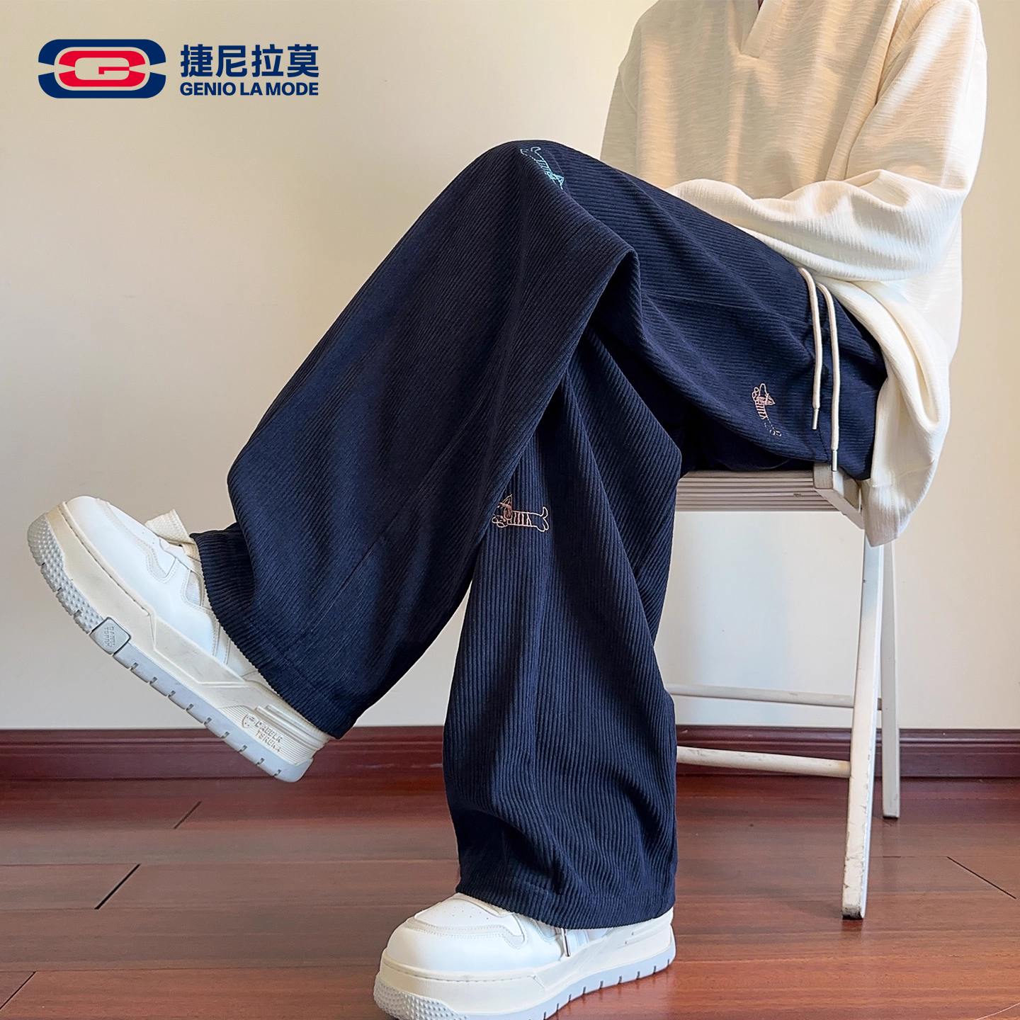 GENIOLAMODE dachshund embroidered corduroy sweatpants men's new fall casual loose sports trousers