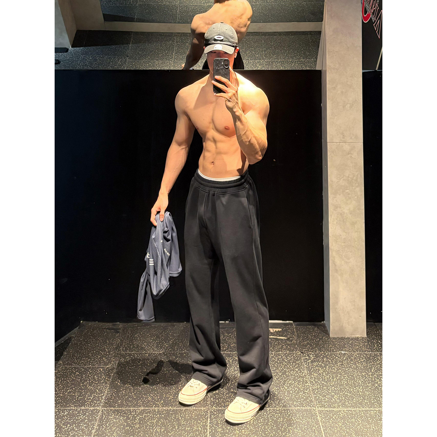Dark gray American fitness sports sweatpants, men's tough guy style, heavy drape slacks, cleanfit scimitar pants