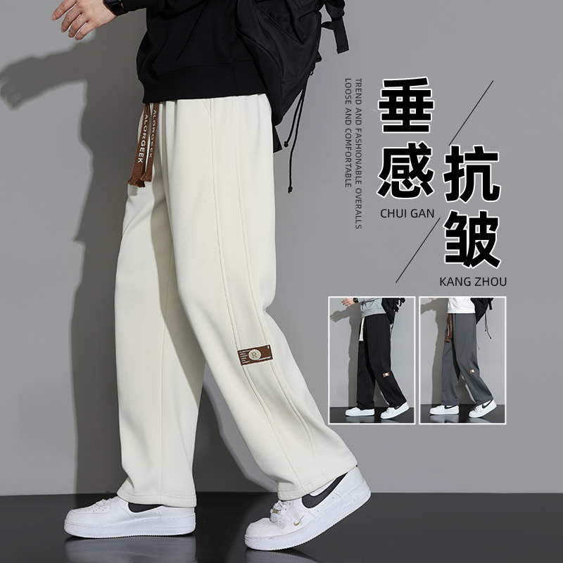 Sweatpants, men's spring and autumn, loose straight fleece thickened pants, loose wide-leg autumn and winter sports and casual trousers