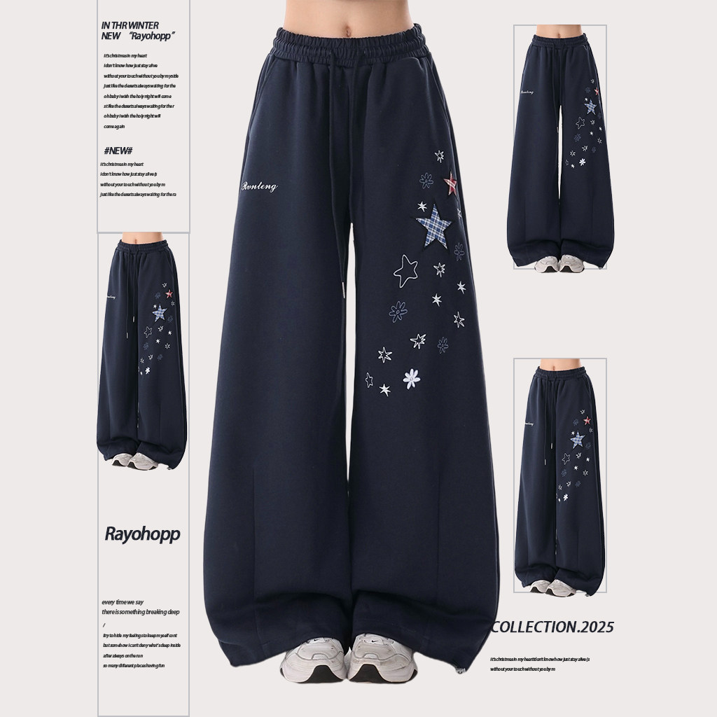 Rayohopp Vintage Embroidery Slacks Women's Fleece Thickened Autumn and Winter New Loose Slimming Sweatpants Wide-leg Pants