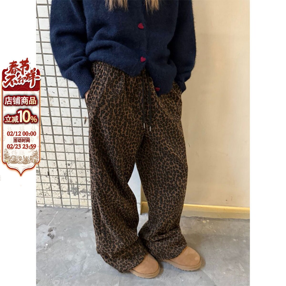 Kawagawa Yajia Maillard plush leopard print sweatpants for men and women, new winter elastic waist loose casual trousers drawstring